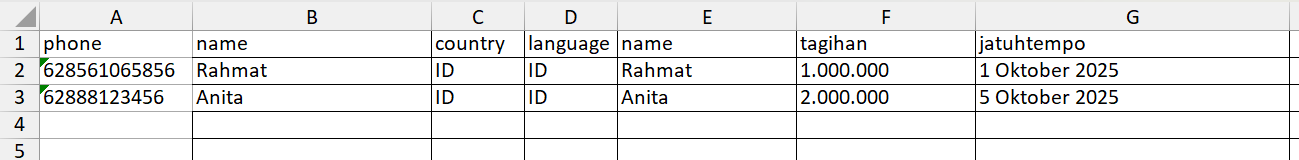 FIle excel haruslah berformat plain text untuk setiap nilai di dalam cell. Kolom pertama harus berisi nomer telepon dengan format lengkap dengan kode negara tanpa tanda +, contoh: 628561065856.